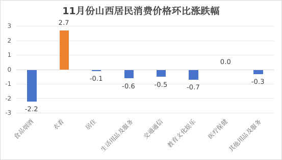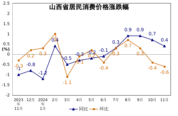 11月份,山西省居民消费价格环比下降0.6%,降幅较上月扩大0.2个百分点。其中,城市、农村均下降0.6%;食品价格下降3.2%,非食品价格与上月持平;消费品价格下降0.7%,服务价格下降0.5%。
