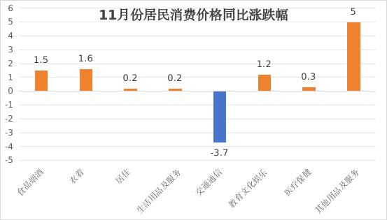 其他七大类价格同比六涨一降。其中,其他用品及服务价格上涨5.0%,衣着价格上涨1.6%,教育文化娱乐价格上涨1.2%,医疗保健价格上涨0.3%,居住价格上涨0.2%,生活用品及服务价格上涨0.2%;交通通信价格下降3.7%。