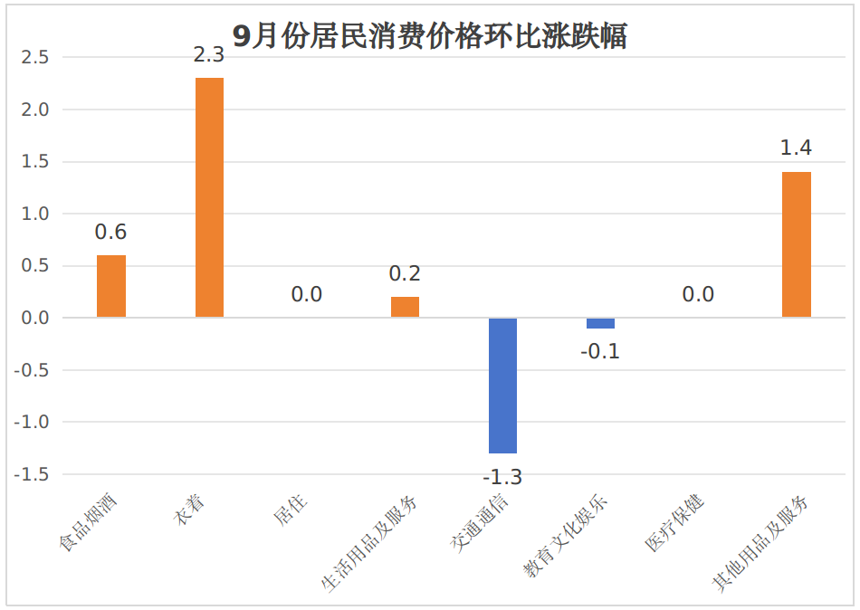 其他七大类价格环比三涨二降二平。其中,衣着价格上涨2.3%,其他用品及服务价格上涨1.4%,生活用品及服务价格上涨0.2%;交通通信价格下降1.3%,教育文化娱乐价格下降0.1%;居住价格和医疗保健价格与上月持平。