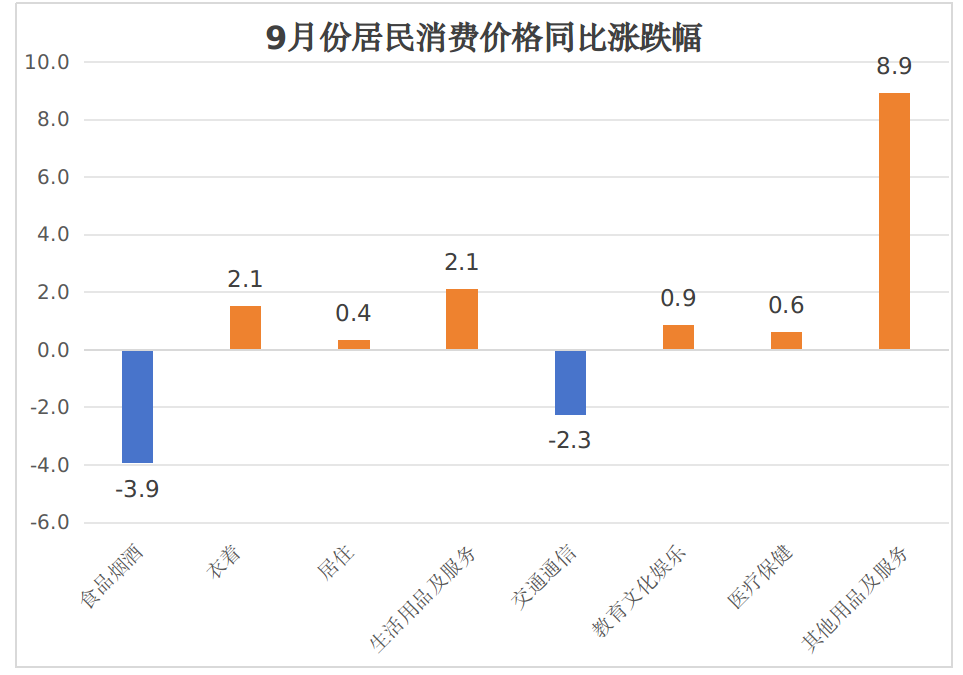 其他七大类价格同比六涨一降。其中,其他用品及服务价格上涨8.9%,生活用品及服务价格上涨2.1%,衣着价格上涨1.5%,教育文化娱乐价格上涨0.9%,医疗保健价格上涨0.6%,居住价格上涨0.4%;交通通信价格下降2.2%。