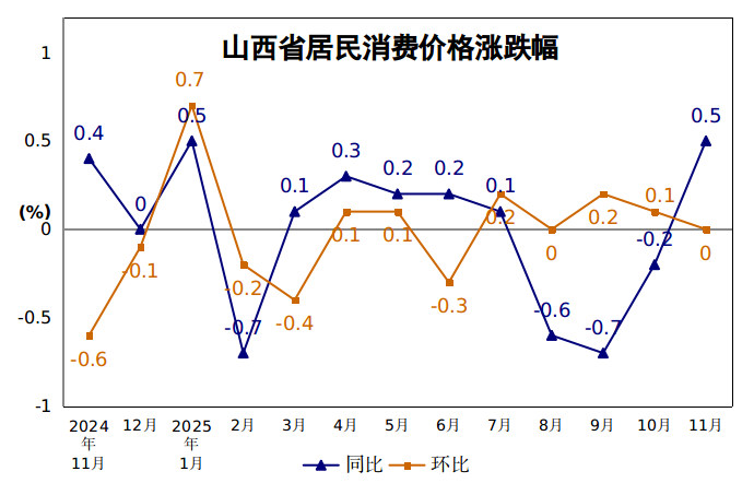 11月份,山西省居民消费价格环比由上月的上涨转为持平。其中,城市下降0.1%,农村上涨0.3%;食品价格上涨1.1%,非食品价格下降0.2%;消费品价格上涨0.4%,服务价格下降0.6%。