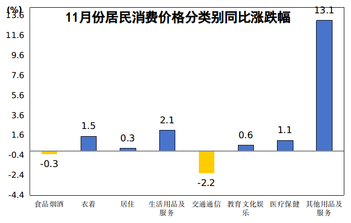 其他七大类价格同比“六涨一降”。其中,其他用品及服务价格上涨13.1%,生活用品及服务价格上涨2.1%,衣着价格上涨1.5%,医疗保健价格上涨1.1%,教育文化娱乐价格上涨0.6%,居住价格上涨0.3%;交通通信价格下降2.2%。