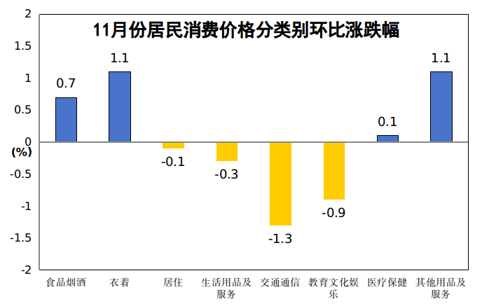 其他七大类价格环比“三涨四降”。其中,衣着价格上涨1.1%,其他用品及服务价格上涨1.1%,医疗保健价格上涨0.1%;交通通信价格下降1.3%,教育文化娱乐价格下降0.9%,生活用品及服务价格下降0.3%,居住价格下降0.1%。